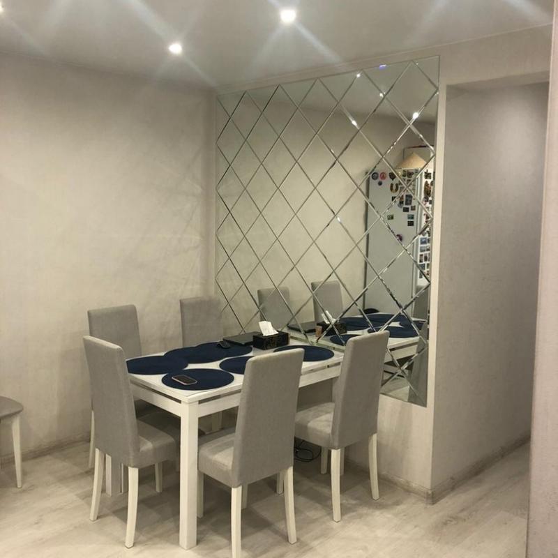Зеркально панно было сделано из зеркальной плитки 30х30 см, размер панно 255х255 см